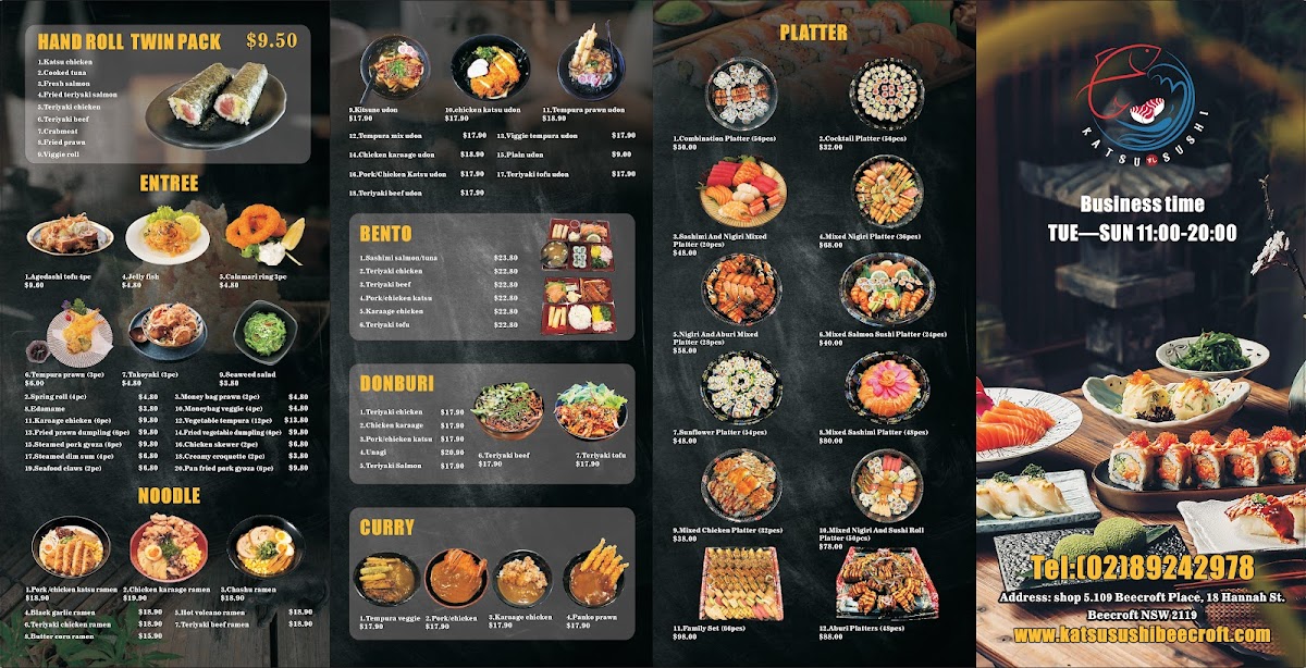 Katsu Sushi Train Beecroft offers a vibrant and fresh take on Japanese cuisine, perfectly blending conveyor belt sushi excitement with made-to-order flexibility. Located in Beecroft NSW, this sushi restaurant features an extensive menu that caters to all tastes—from classic nigiri and sashimi platters like the Combination Platter and Aburi Platters to creative rolls such as the Katsu Chicken Cream Cheese and Teriyaki Beef Tiger Roll. The freshness of their seafood and ingredients is immediately noticeable, accompanied by a friendly, attentive service that enhances the dining experience.